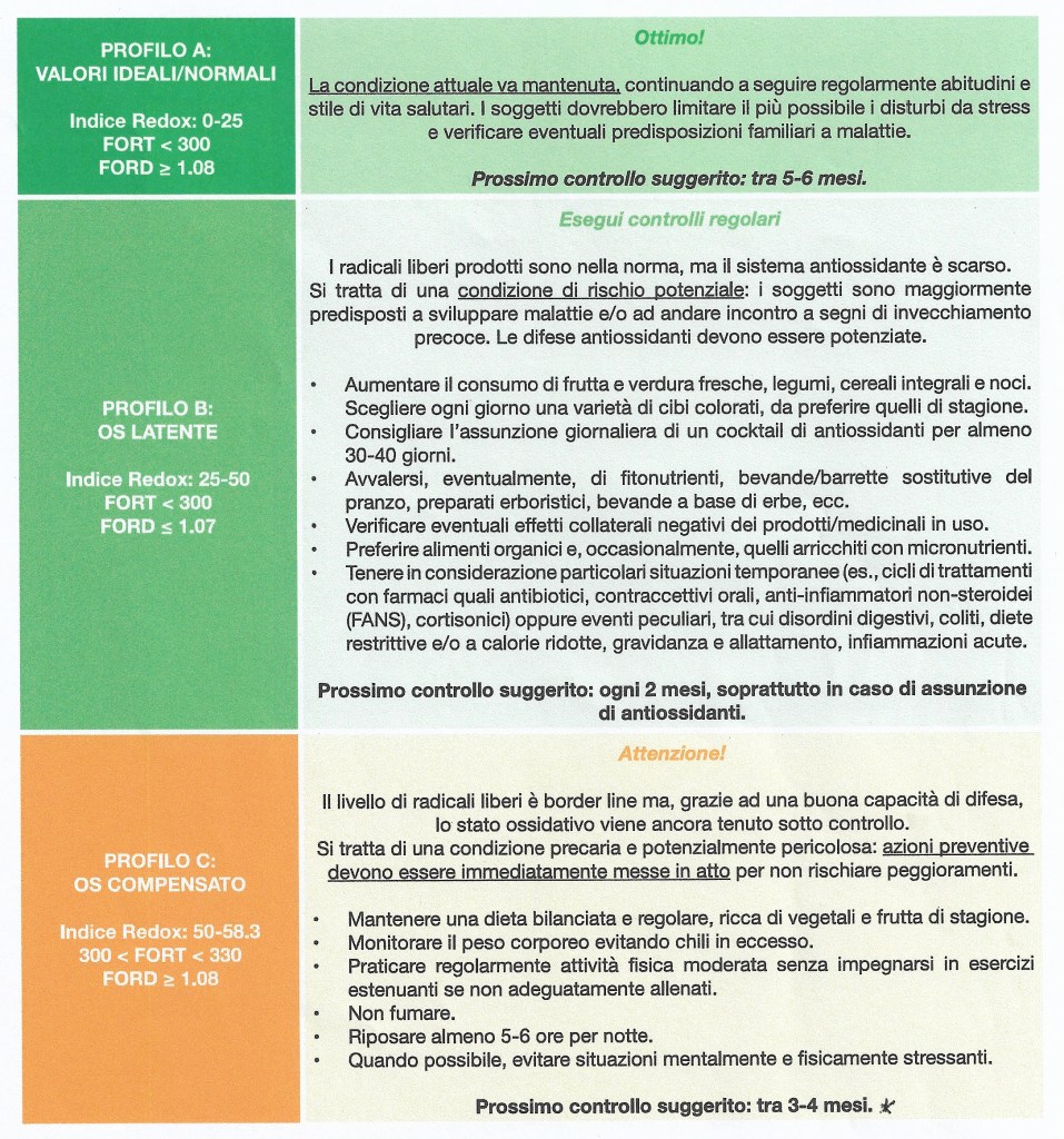 Test FORT (Free Oxygen Radical Test): misura il livello di radicali liberi presenti nel corpo. Se il risultato è alto, significa che i radicali liberi sono in eccesso, e quindi c’è uno stress ossidativo.